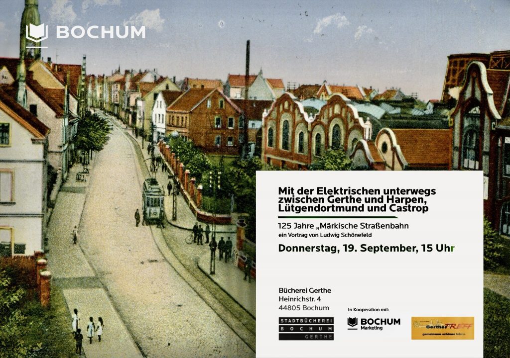 Unser Vereinsmitglied Ludwig Schönefeld hält am Donnerstag, 19. September, einen Vortrag in Bochum-Gerthe. Aus Anlass des 125. „Geburtstags“ der Märkischen Straßenbahn stellt er deren bewegte Geschichte dar. Der Vortrag unter dem Titel „Mit der Elektrischen unterwegs zwischen Gerthe, Harpen, Lütgendortmund und Castrop“ beginnt um 15 Uhr in der Bücherei Gerthe, Heinrichstraße 4 in Bochum-Gerthe.