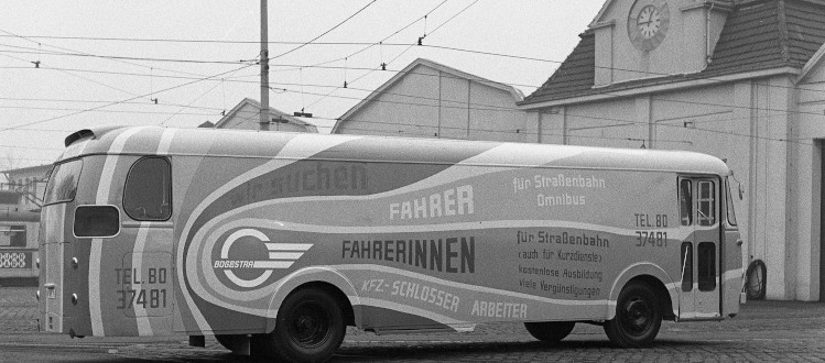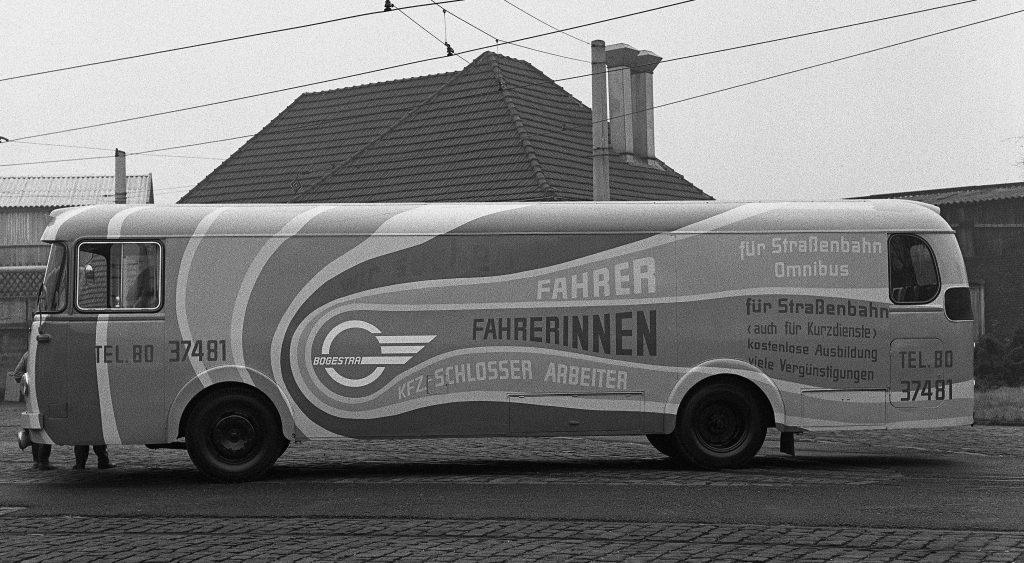 Auch vor 55 Jahren gab es bereits einen Mangel an Fahrern. Im Dezember 1970 ging die BOGESTRA einen neuen Weg. Ein ausgedienter Krauss-Maffei Bus wurde mit einer Ganzreklame versehen und diente fortan der Werbung für neue Fahrer. Der Bus wurde in Wohngebieten aufgestellt und trumpfte mit Infos – so die Hoffnung der BOGESTRA.